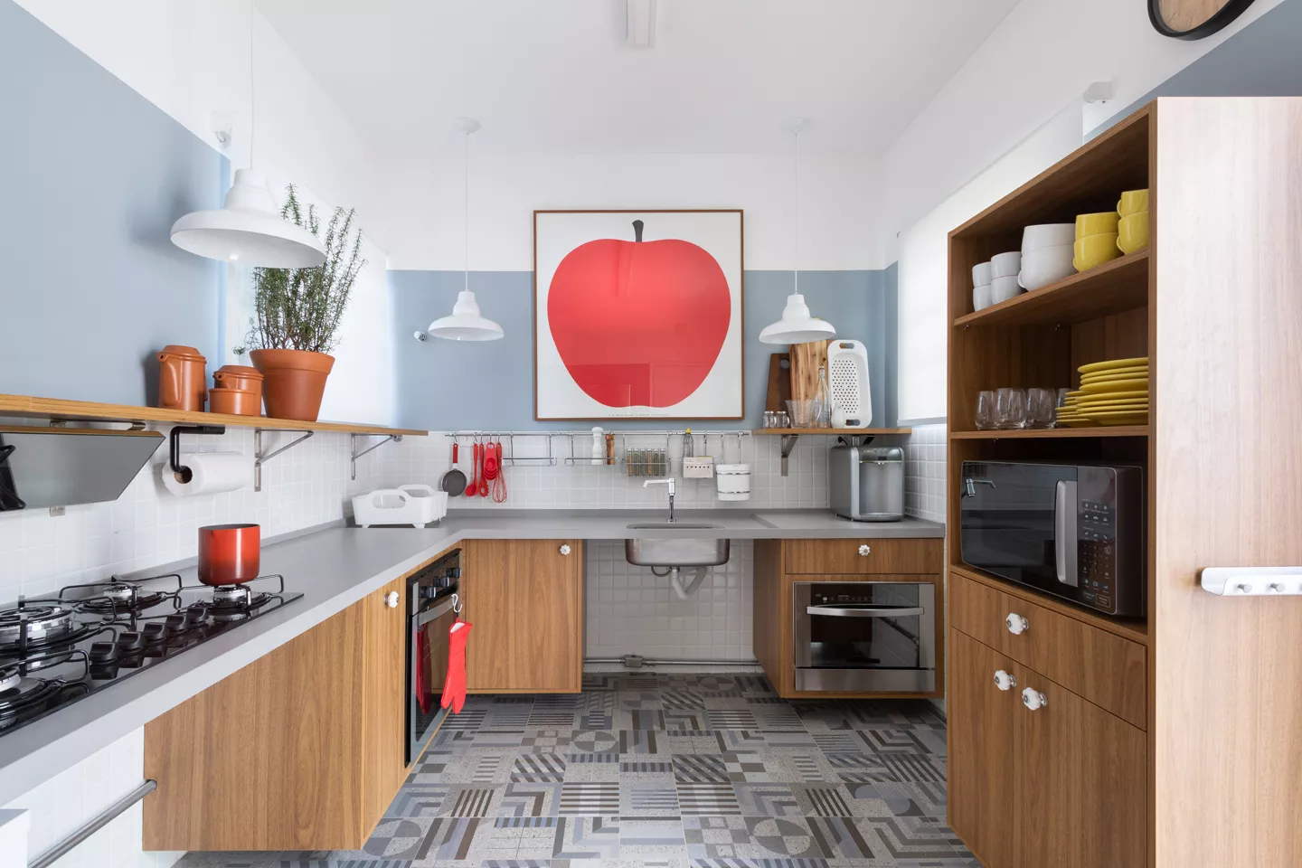 Indica-se que bancadas e móveis tenham altura de cerca de 1,20 metro, considerando adultos que não sejam pessoas com nanismo. Se tiver essa condição, a recomendação é que instale bancadas e móveis com altura menor.