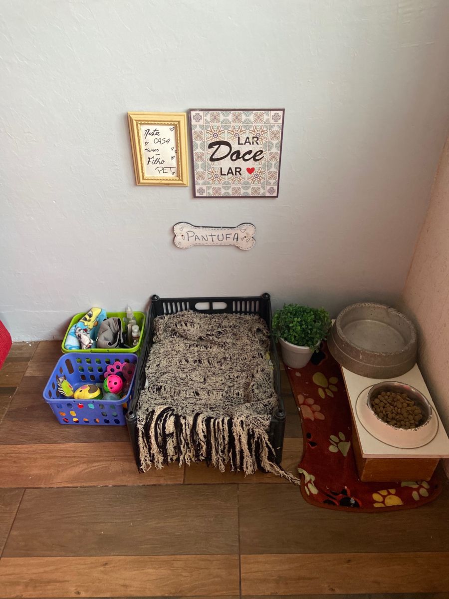 Nele, coloque os itens essenciais do pet! Você pode disponibilizar, por exemplo, caminhas e brinquedos para o animal. Se tiver gatos, considere colocar arranhadores na área.