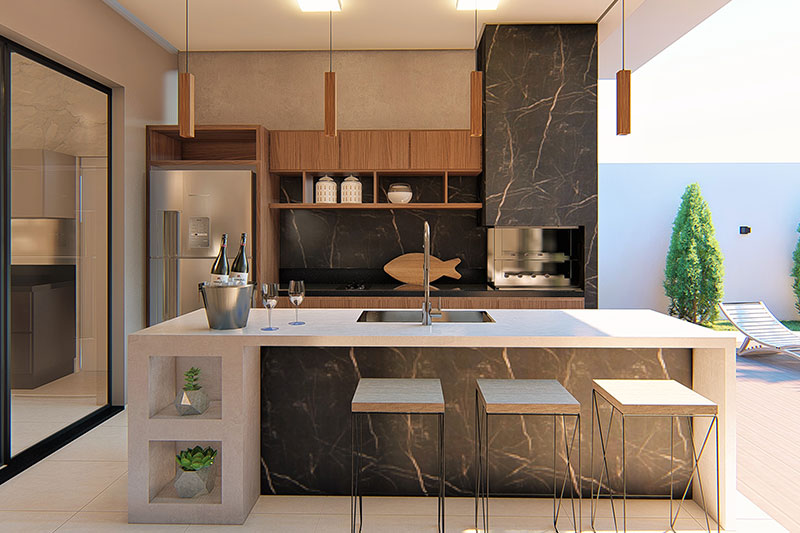 Além de ser bonita, ela precisa ser funcional – então verifique onde ficaria melhor uma bancada ou onde é mais indicado instalar a churrasqueira.