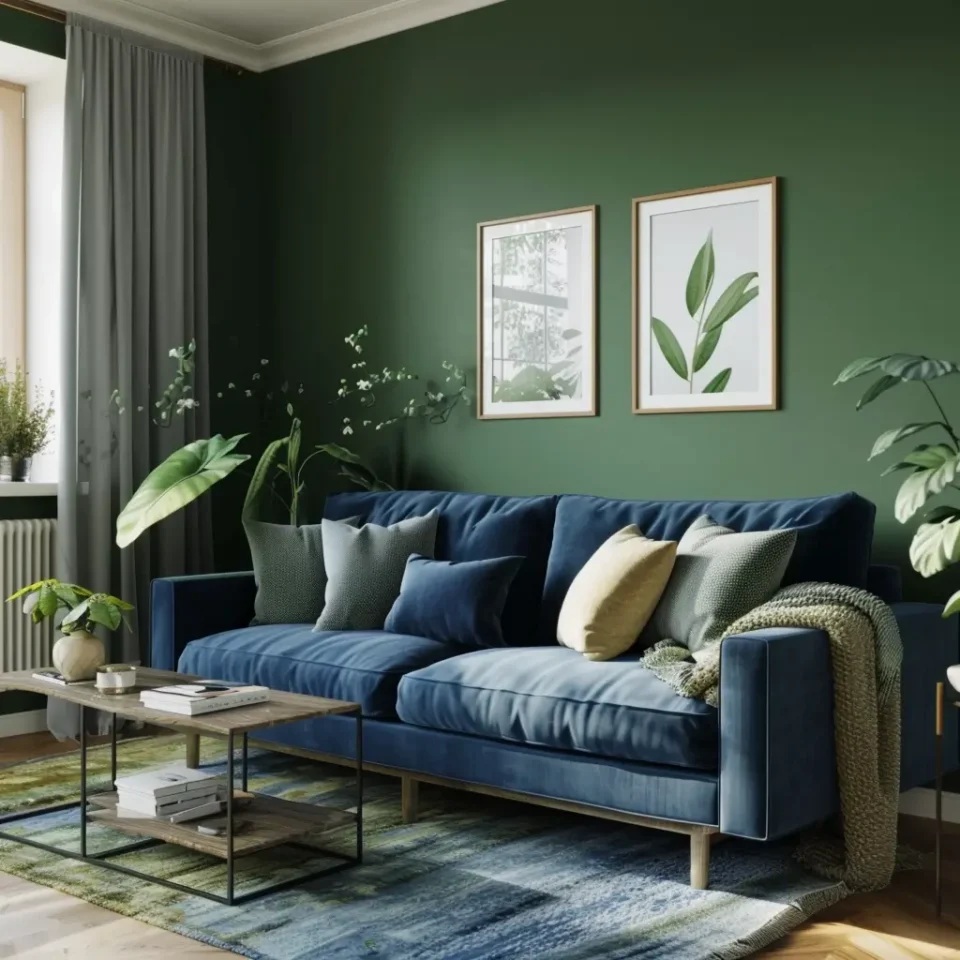 Logo, essa combinação funciona bem em escritórios, salas de estar e quartos. Além disso, você pode usar o verde nas paredes ou móveis maiores, enquanto o azul profundo pode ser inserido em detalhes como almofadas, cortinas ou acessórios. O resultado é um contraste harmônico e moderno.