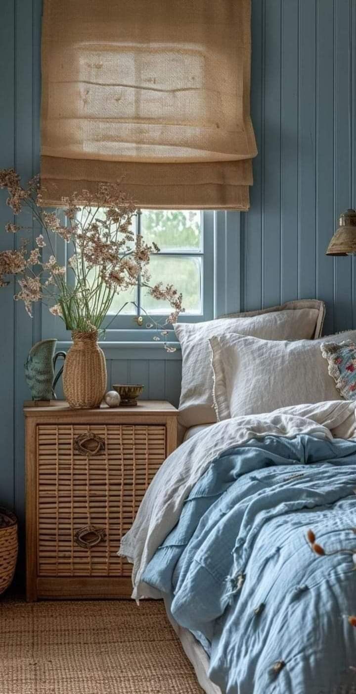 O azul empoeirado, é uma das cores favoritas para quartos em 2025. Ele traz uma sensação de calma, mas sem cair na monotonia dos azuis tradicionais.