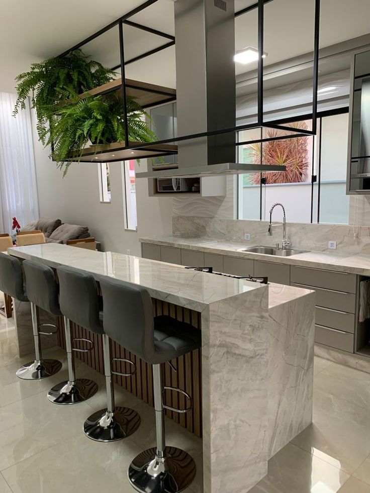 A disposição do balcão de mármore na cozinha americana deve ser planejada para otimizar a funcionalidade e o visual do espaço. Confira algumas ideias: