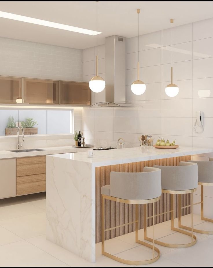 O mármore branco também se integra harmoniosamente com armários em tons claros e detalhes em madeira, criando um ambiente sofisticado e acolhedor.