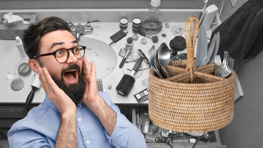 Esse utensílio, que originalmente usamos para armazenar colheres, garfos e facas, pode ser facilmente adaptado para a organização do banheiro.