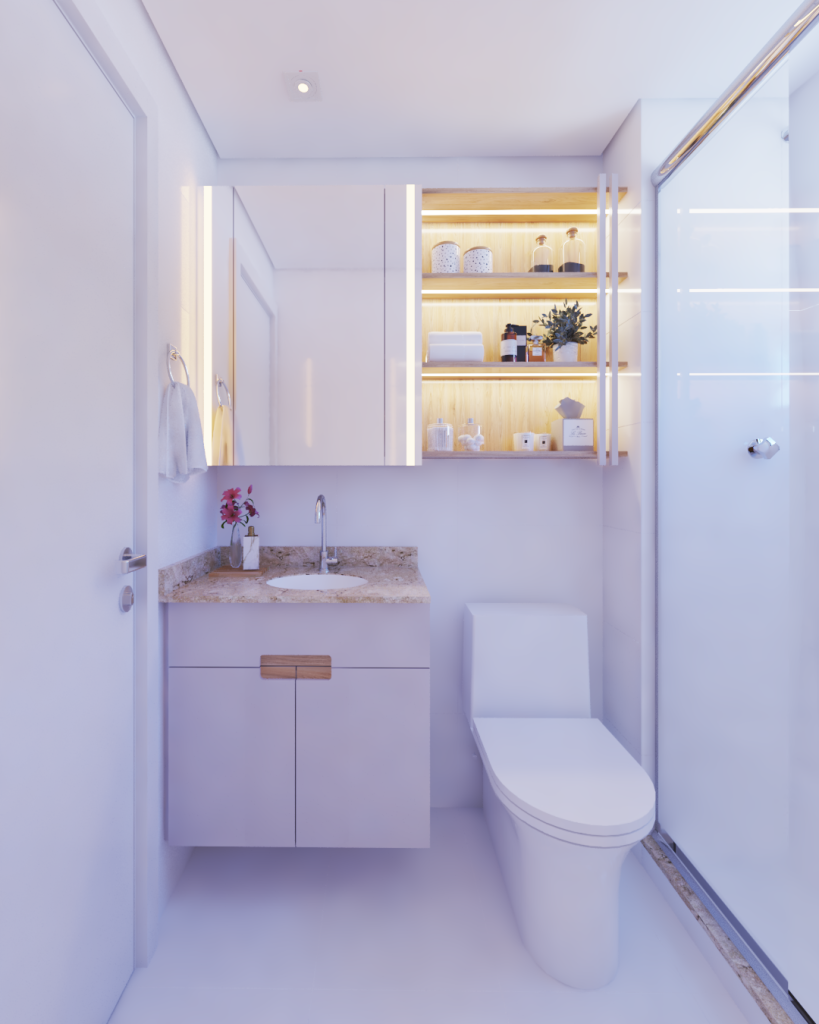 Se o banheiro já foi entregue com bancada em granito ou mármore, você pode aproveitá-la e criar um armário logo abaixo. Na parte superior, um armário aéreo com espelho, prateleiras e boa iluminação fará toda diferença.