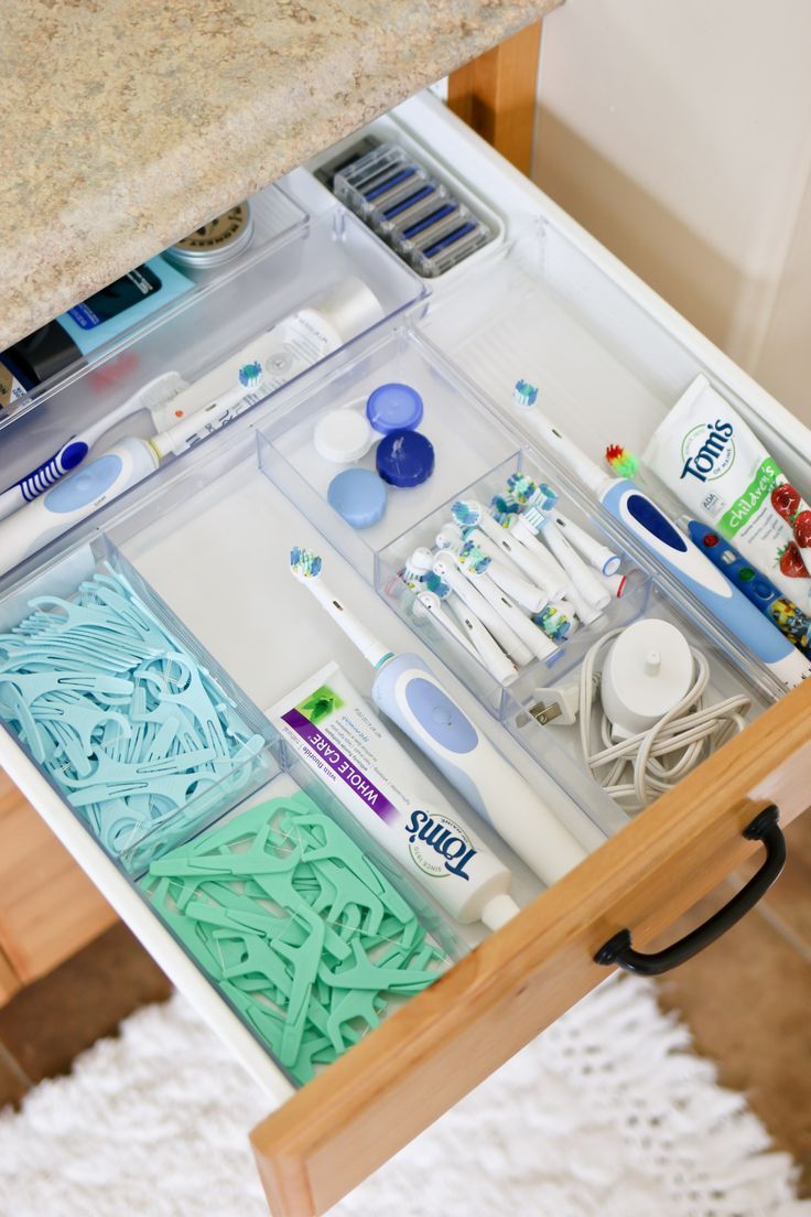 Depois, organize os itens dentro do armário do banheiro. O ideal é que deixe tudo o que usa mais no dia a dia na frente. Se colocar no fundo, quando precisar alcançar algum item ou produto correrá o risco de fazer bagunça.