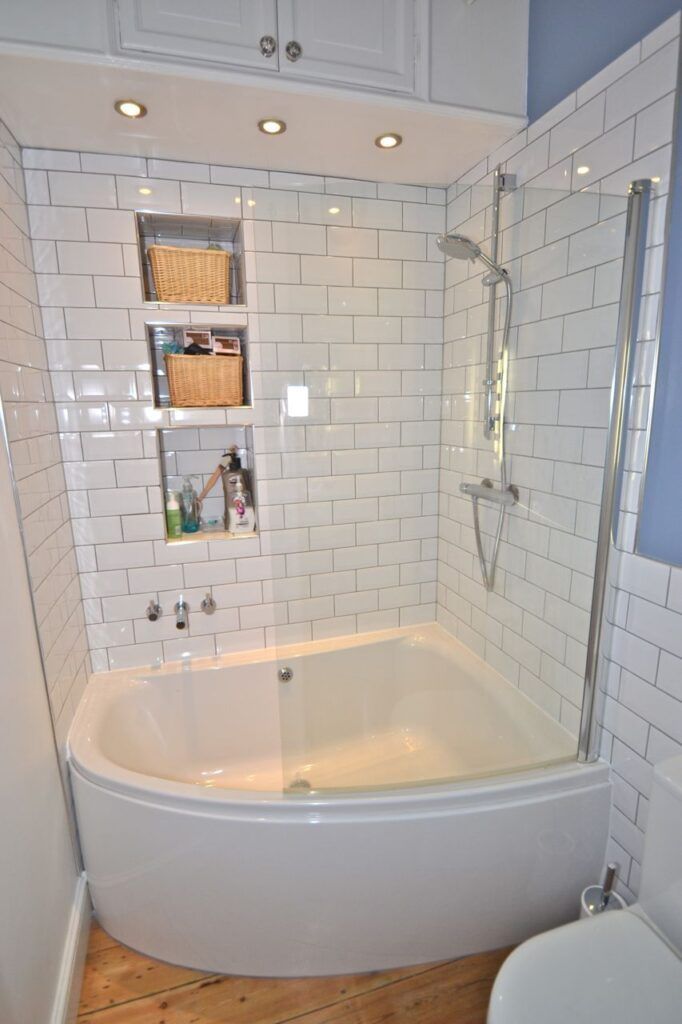 A banheira de canto é outra opção prática e eficiente para banheiros pequenos.