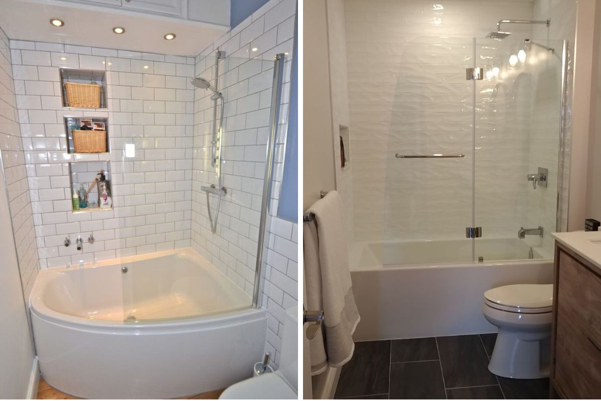 Escolha uma banheira que tenha um design retangular e instale-a no próprio box do chuveiro, com vidro ao redor para evitar respingos.