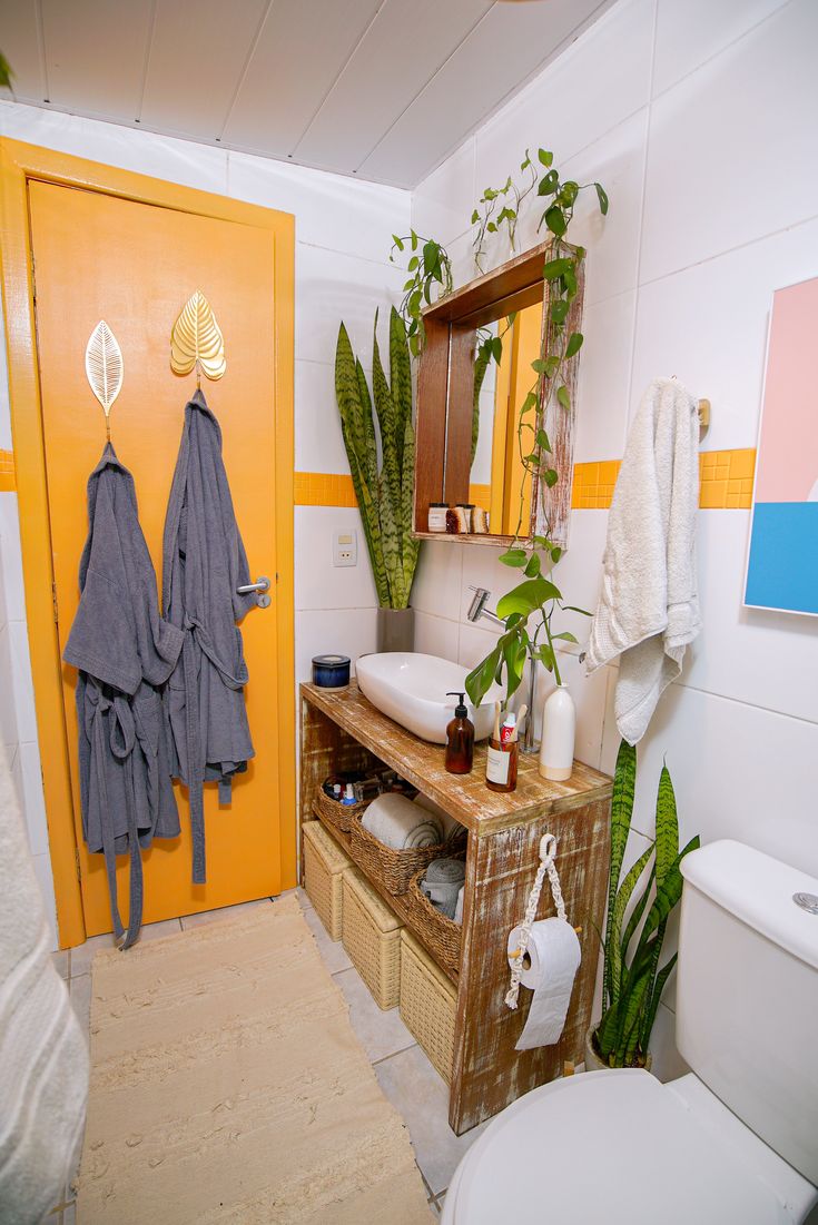 Banheiros pequenos podem ganhar vida com cores vibrantes como laranja, amarelo ou verde, combinadas com elementos naturais.