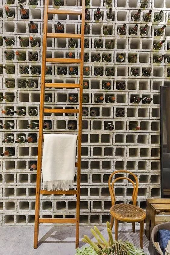 Os furos dos blocos de concreto são perfeitos para acomodar garrafas. Utilize para criar uma adega ou para servir de base em um móvel de bar.