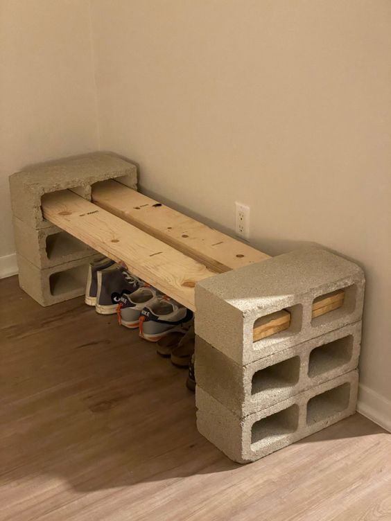 Os blocos podem servir de base para a criação de bancos, apoiando tábuas de madeira sobre eles. Use almofadas ou assentos acolchoados para maior conforto.