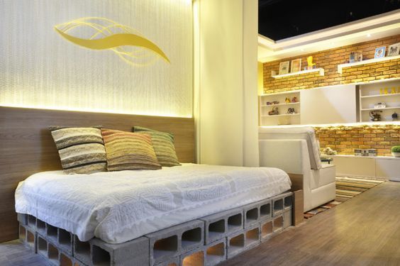 Também é possível criar uma base para cama com os blocos de concreto. O colchão fica sobre a estrutura, e os furos criar um efeito super interessante, ainda mais se utilizarmos iluminação interna.