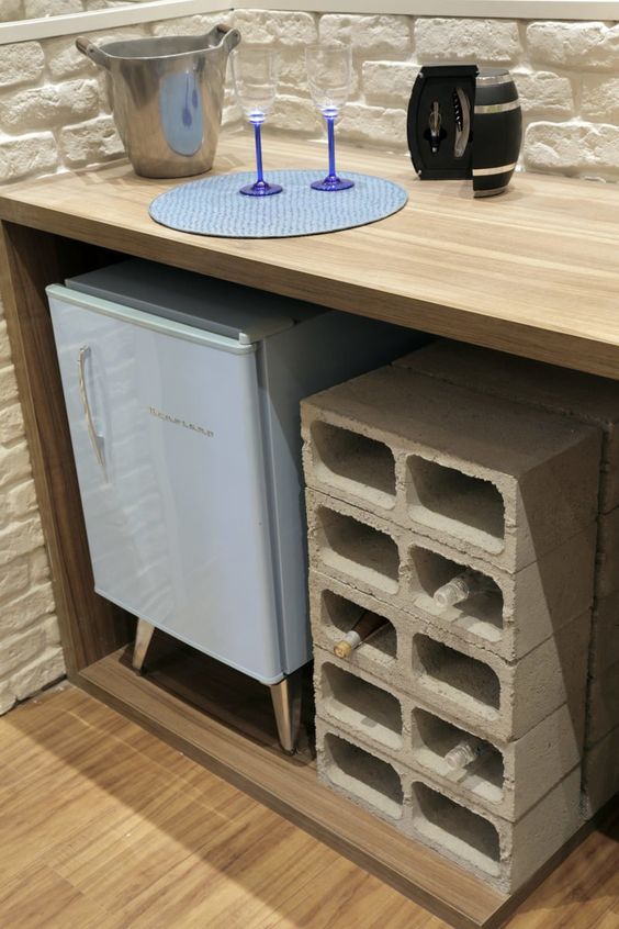 Os furos dos blocos de concreto são perfeitos para acomodar garrafas. Utilize para criar uma adega ou para servir de base em um móvel de bar.