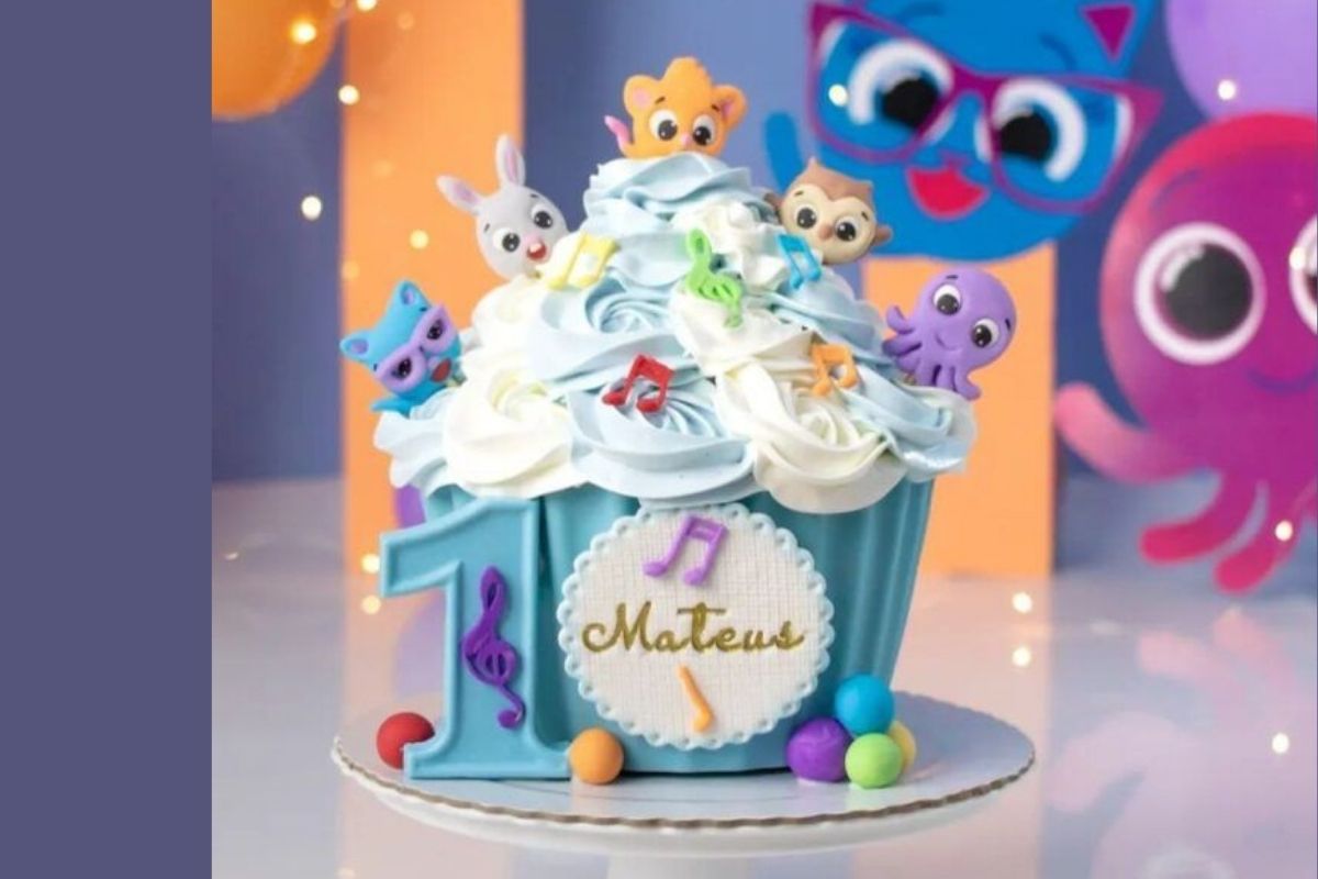 Uma inspiração muito legal é a do bolo em tamanho normal em formato de um cupcake gigante. É divertido e adorável com as miniaturas dos personagens do desenho decorando o topo.