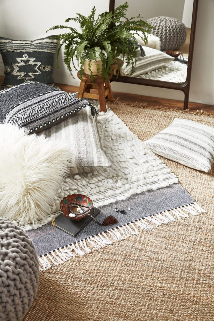 É bem comum praticar meditação no chão, então o tapete precisa ser feito de tecido macio e de textura gostosa ao toque, sempre prezando, é claro, pelo minimalismo.