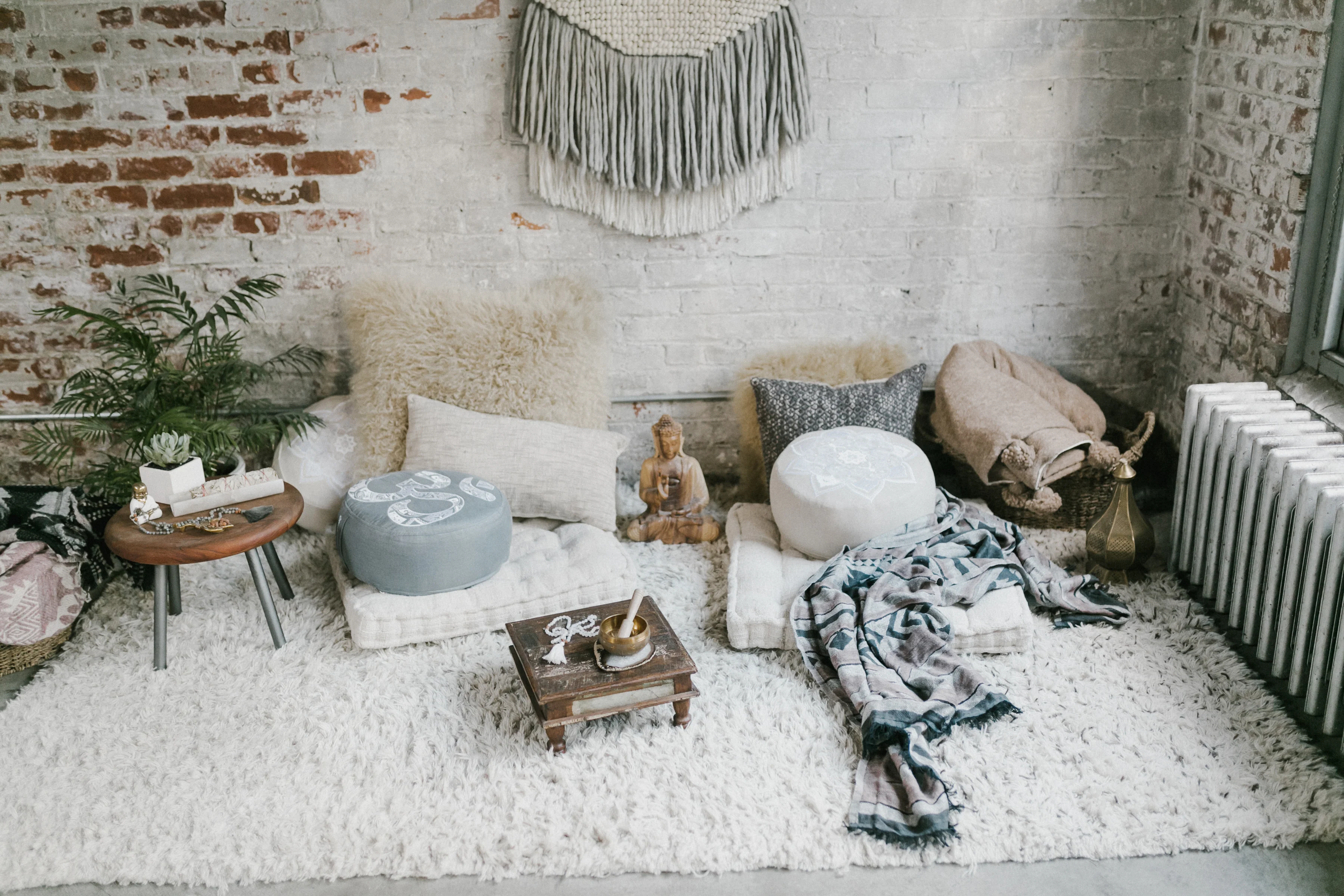 Se você estiver com espaço limitado, uma ideia é você aproveitar o chão: use tapetes e almofadas confortáveis para acomodar-se em seu momento de relaxamento.
