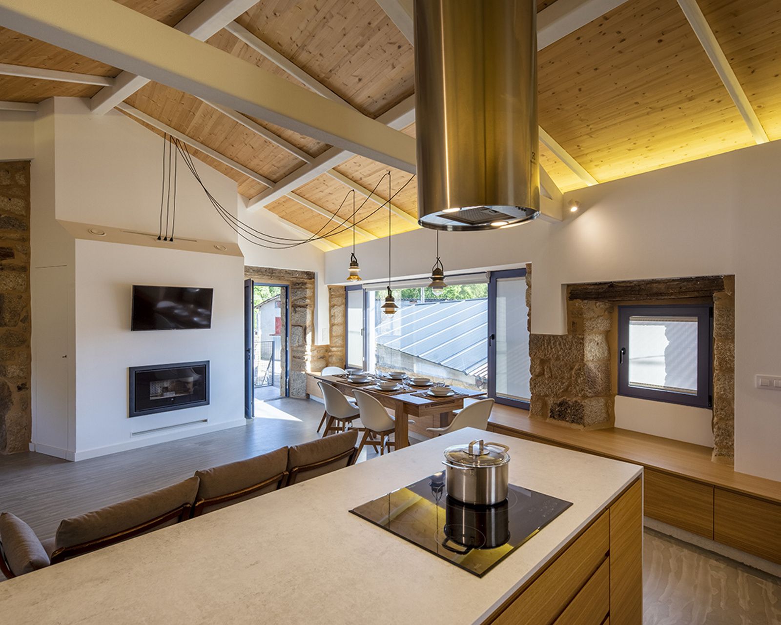A renovação completa da casa abandonada envolveu a junção de outras três antigas, igualmente feitas de pedra. Elas foram transformadas em um único imóvel, garantindo um resultado surpreendente.