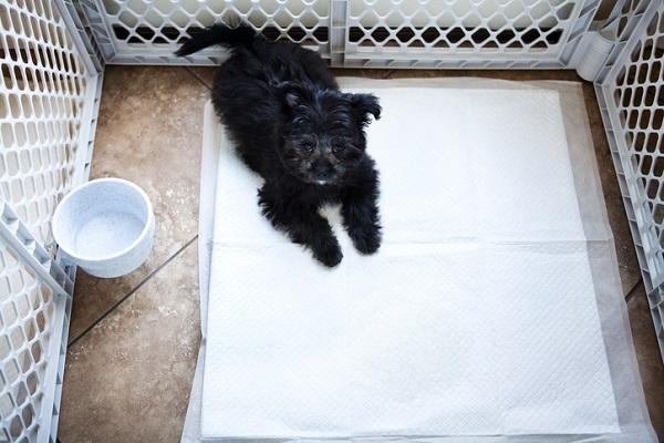 Espalhe tapetes higiênicos em um canto e deixe um pote de água e uma cama. Se tiver tempo, supervisione o período em que o animal está no cercado. Se ele acertar o local de fazer as necessidades, demonstre que está contente com isso e recompense o filhote com petiscos.
