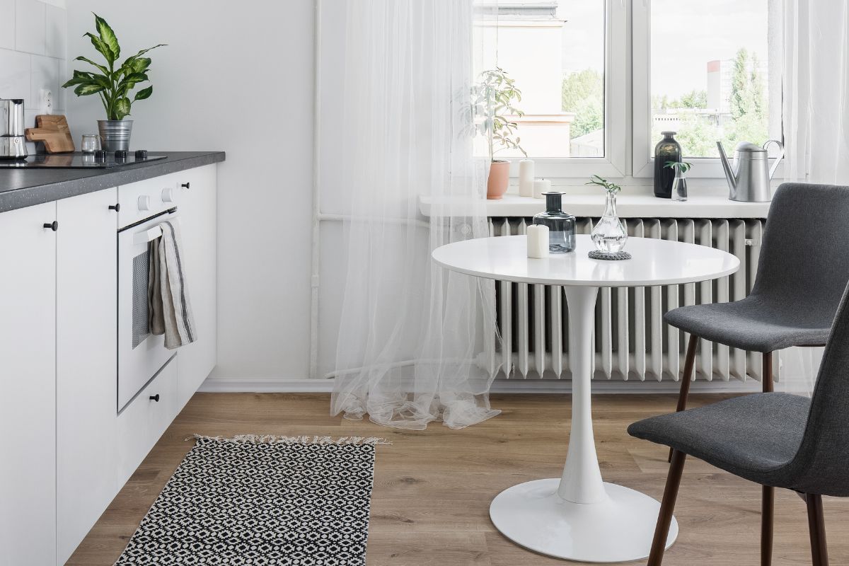 Uma mesa redonda pequena é perfeita para cozinhas compactas. Ela ocupa menos espaço do que as mesas quadradas ou retangulares e facilita a circulação no ambiente.