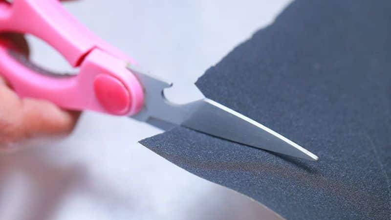 Dobre sua lixa no meio com os lados ásperos para fora e comece a cortar a folha, entre 10 a 20 vezes – a cada cortada a sua tesoura ficará mais afiada!