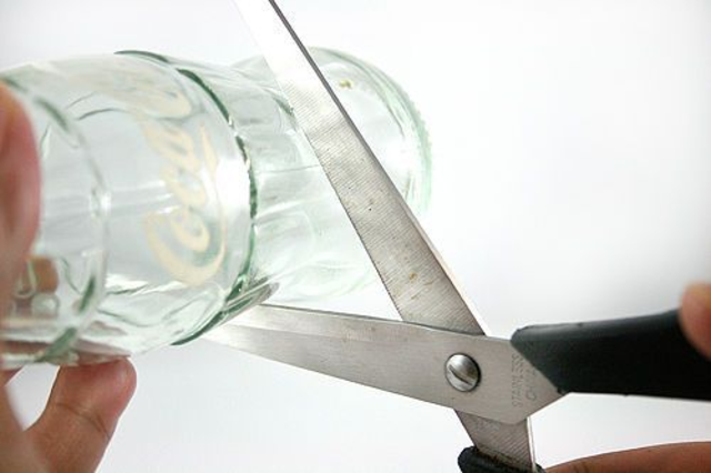 Escolha um pote de vidro que possa ser descartado e encaixe as lâminas da tesoura ao redor do pote, abrindo a mesma o máximo possível. Segure a tesoura com uma mão e o pote com a outra, e faça movimentos de corte – feche a tesoura de modo que o pote deslize para fora do corte.