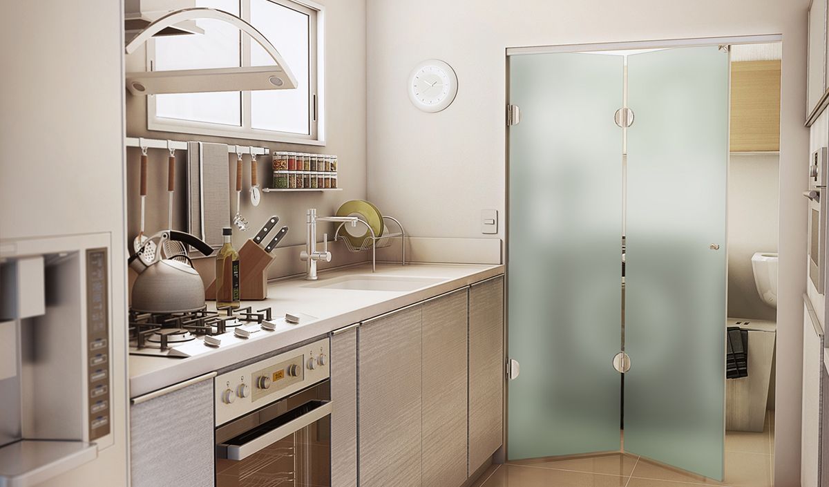 No que se refere ao tipo de porta, a de correr, a pivotante (tem abertura que se assemelha a uma porta tradicional) e a articulada são as melhores alternativas.