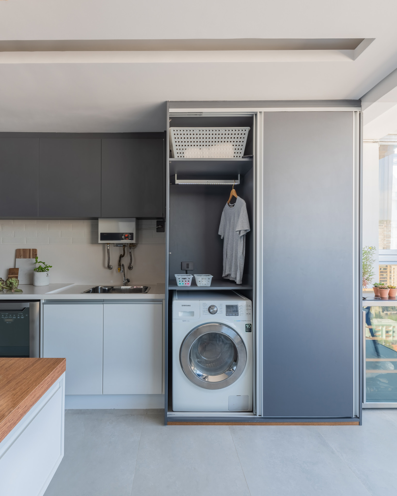 Em imóveis com a área de serviço integrada à cozinha, é comum querer disfarçar a lavanderia. Isso é importante não somente para a decoração, mas também para evitar que roupas fiquem com cheiro de comida.