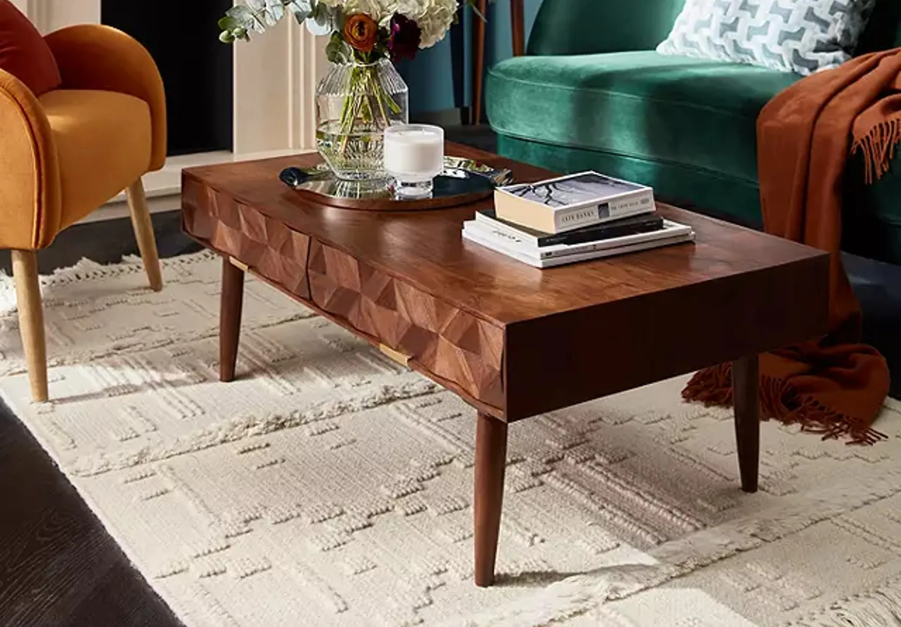 Para começar, pense em quanto espaço você deseja preencher com a mesa de centro para, em seguida, escolher um móvel que caiba sem que o cômodo fique visualmente exagerado (ou o oposto).