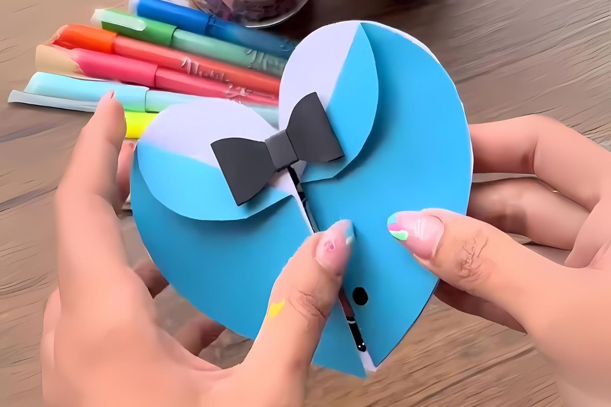 Para esse cartão você começará cortando um coração na folha branca, e logo depois, irá transformá-lo em um belo paletó. Confira o passo a passo: