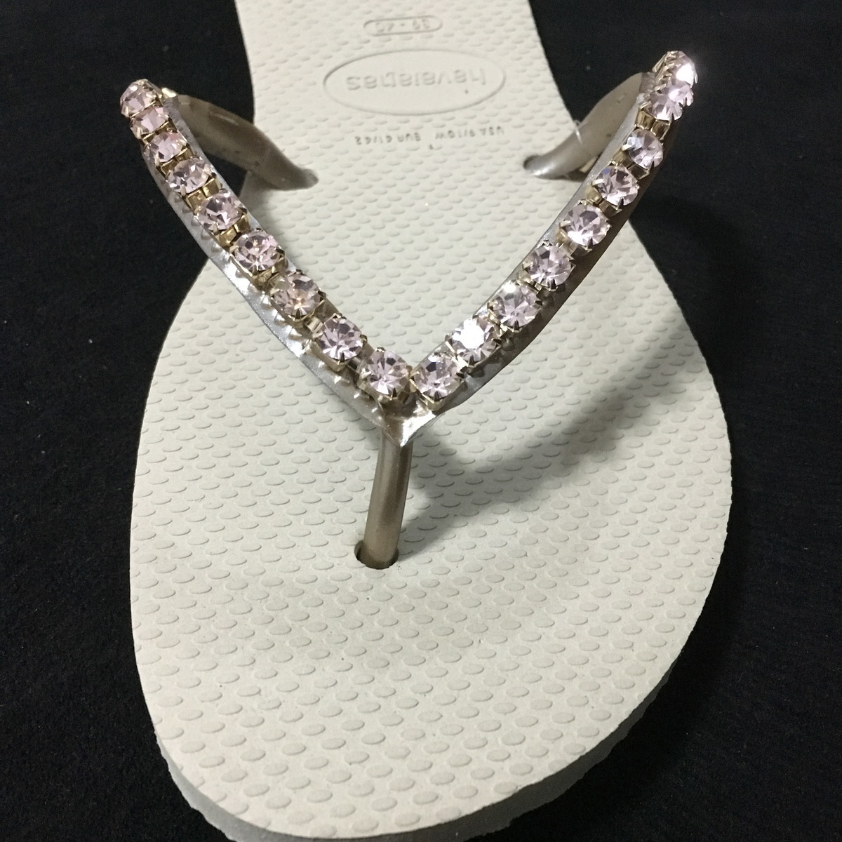 A dica para facilitar seu trabalho é usar o strass autocolante, que deve ser aplicado na parte superior da alça do chinelo. Se preferir, também dá para aplicar o strass na lateral da sola do acessório.