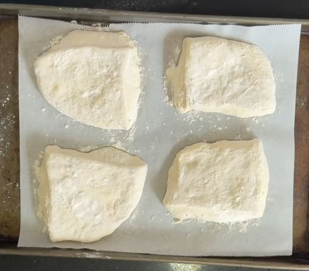 No dia seguinte, retire a massa da geladeira e transfira-a para uma superfície bem enfarinhada. Divida em quatro partes iguais e modele em formatos ovais ou levemente quadrados.