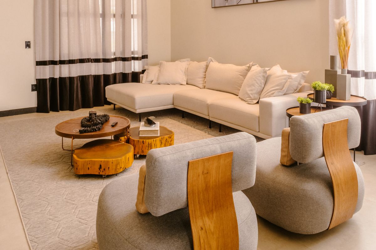 - Em salas maiores, uma combinação de sofá, poltronas e mesas de centro pode criar um ambiente acolhedor e convidativo.