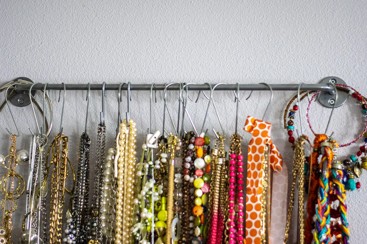 Como os colares embolam em tudo, a melhor forma de organizar essas bijuterias – de modo eficiente – é mantê-los longe dos demais itens e, como já se deve imaginar, pendurá-los para que fiquem na vertical.