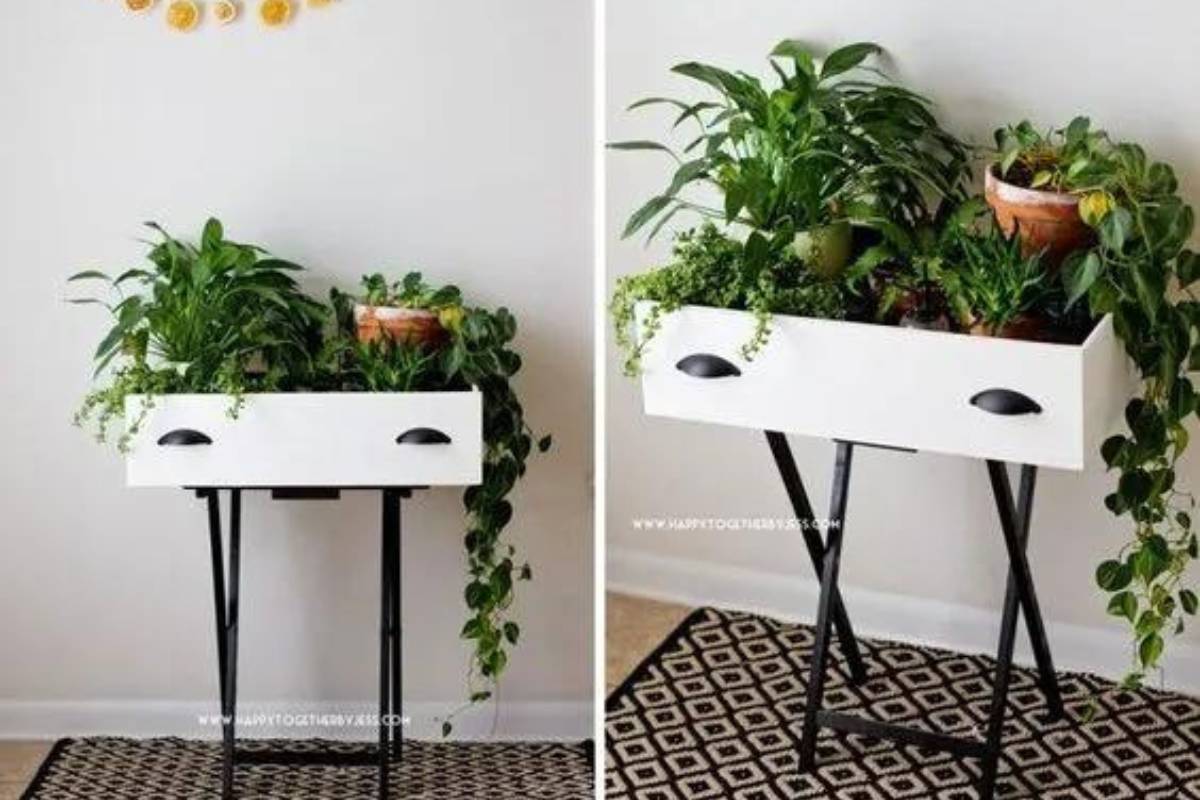 Com uma base firme, seja ela um banquinho antigo ou madeira, sua gaveta transforma-se em uma mesinha charmosa. Vasos de plantas ou outros objetos de decoração podem ser adicionados, conferindo personalidade ao móvel. Além disso, a mesinha pode ser usada para guardar objetos, mantendo a função de uma gaveta comum.
