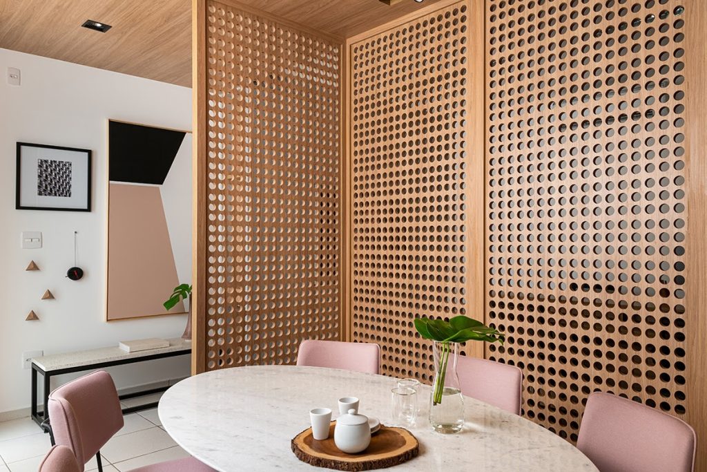 Caso prefira, você também pode instalar painéis fixos e vazados, como os que são confeccionados com ripas de madeira. Porém, como resultado, não terá um grau de privacidade maior para os ambientes.
