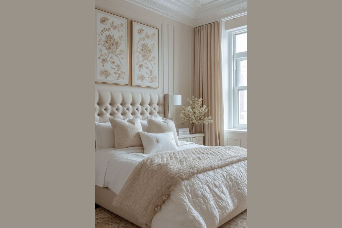As paredes, roupa de cama e cabeceiras nessas nuances ajudam a emanar uma atmosfera limpa e de gosto refinado.