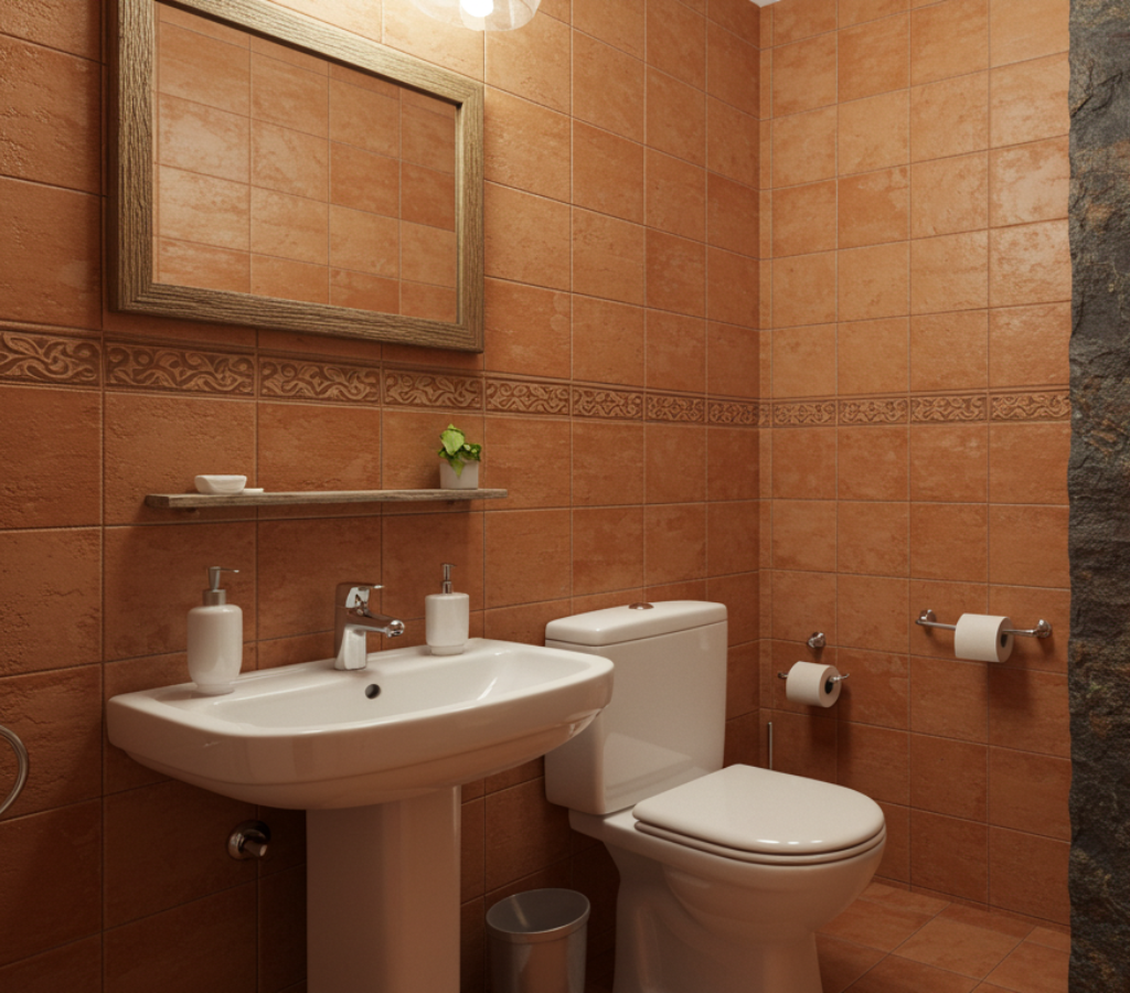 Marrom, terracota e areia são boas opções para quem deseja um banheiro mais acolhedor e sofisticado.