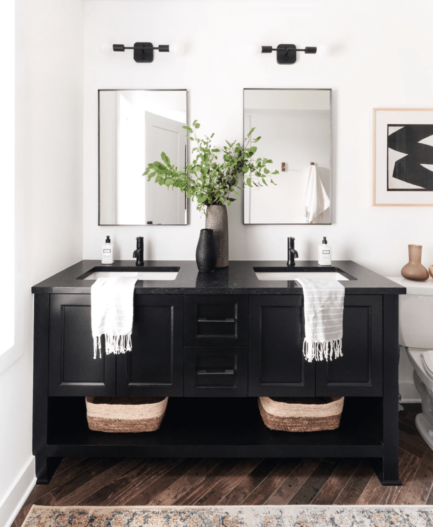 O preto pode aparecer em diferentes detalhes da decoração, como nas paredes, no piso, no box do banheiro, no gabinete, na cuba da pia, entre outros. A dica é que procure combiná-lo com outras cores para ter um ambiente mais claro.