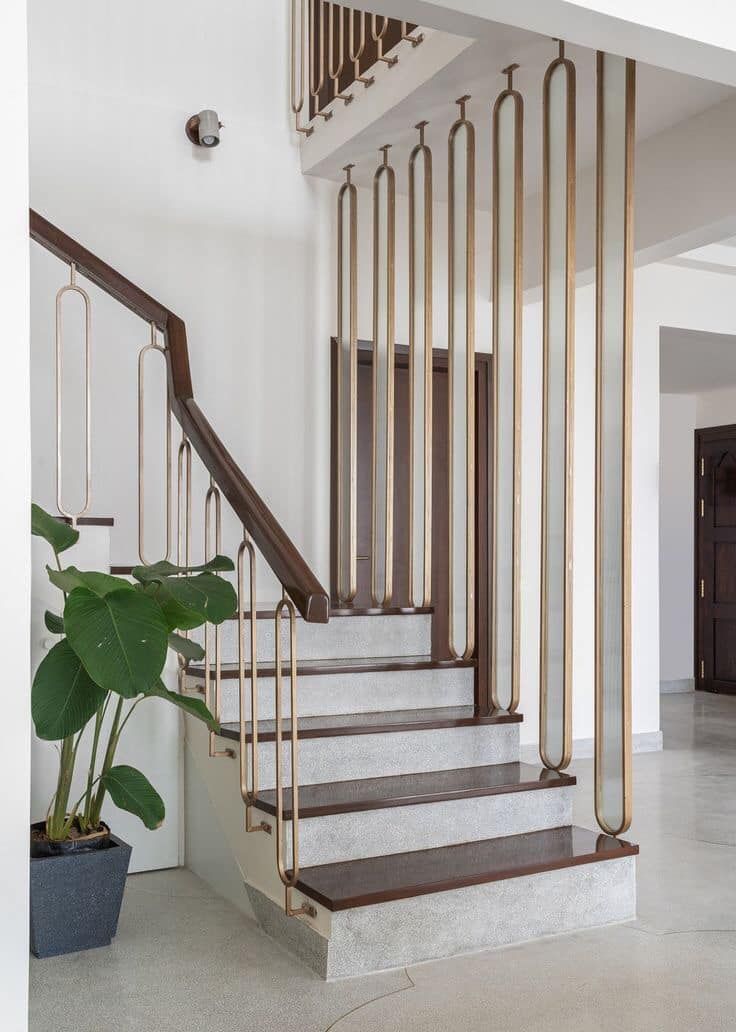 Para quem busca um toque de luxo, o corrimão com detalhes em latão é ideal para ambientes mais clássicos ou art déco, onde o brilho do latão pode complementar outros elementos decorativos dourados ou de metal.
