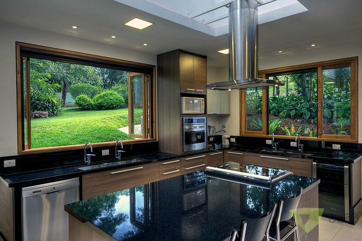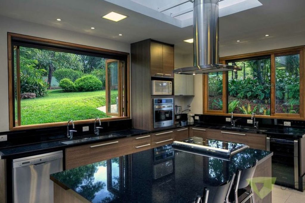 Cozinhas que dão para jardins, quintais ou áreas verdes se beneficiam enormemente dessa configuração, trazendo a natureza para dentro de casa.