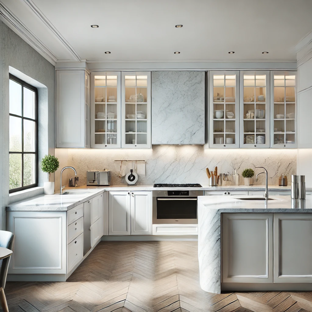 Combinar o granito branco com armários em tons de branco ou off-white cria um visual sofisticado, assim como apostar em armários estilo cristaleira, com o vidro suavizando ainda mais a estética do espaço.