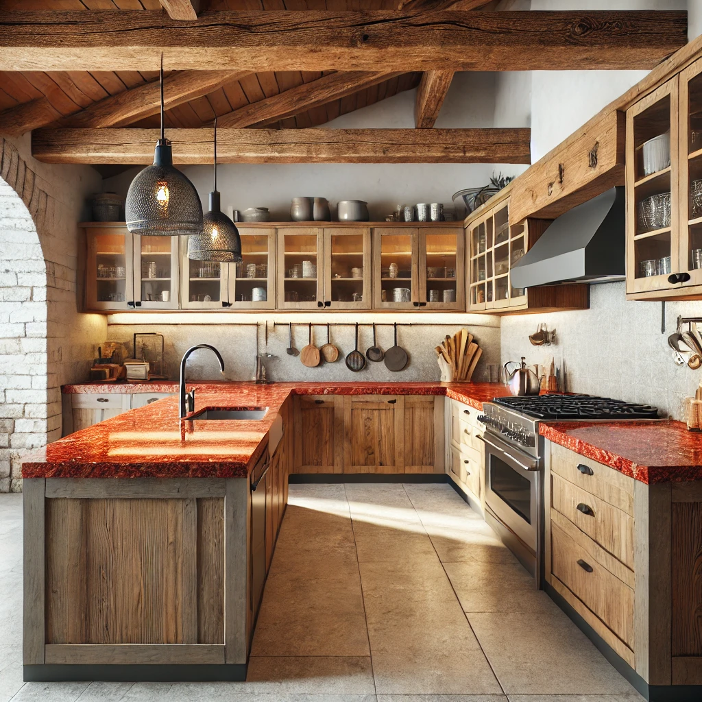 Para um ambiente acolhedor e cheio de personalidade, a cozinha rústica em L, combinando madeira natural e granito vermelho, cria um espaço convidativo e cheio de charme.