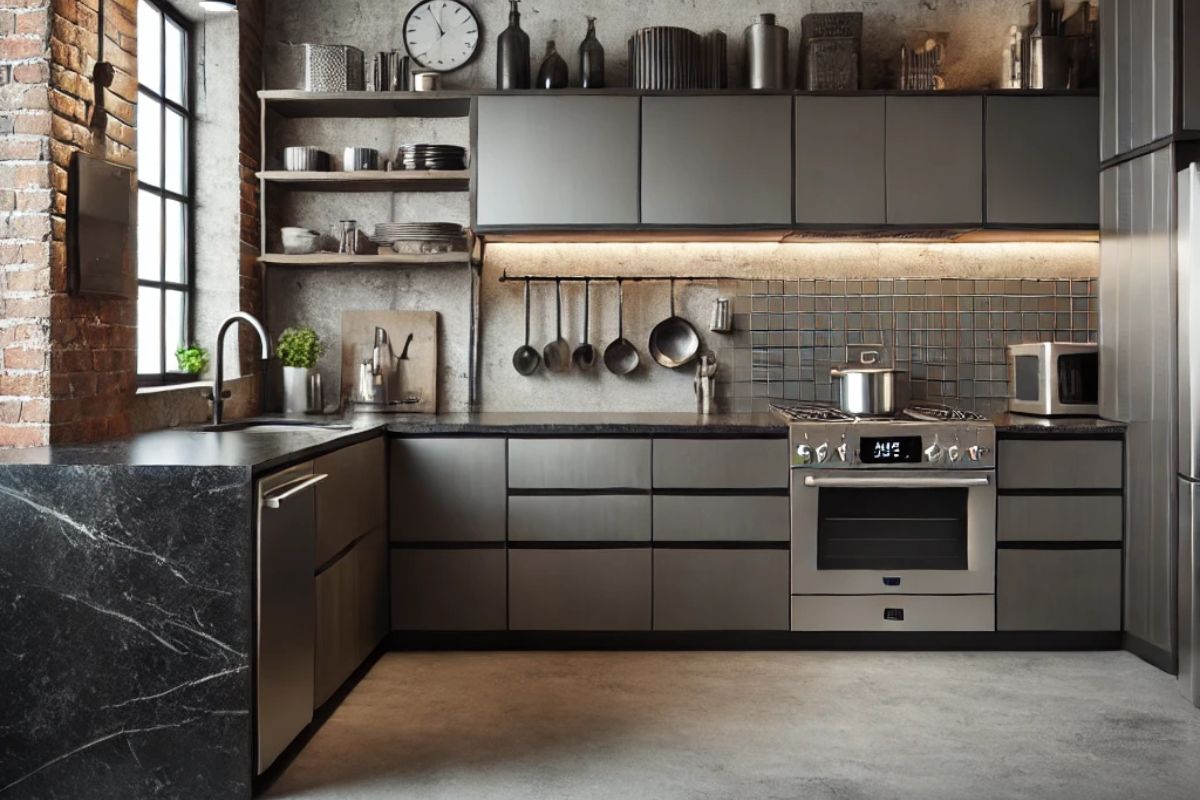A estética industrial é marcada por elementos rústicos e materiais expostos, como tijolos, concreto e metal. Uma cozinha em L com bancada de granito preto, complementa perfeitamente esse estilo robusto e funcional.