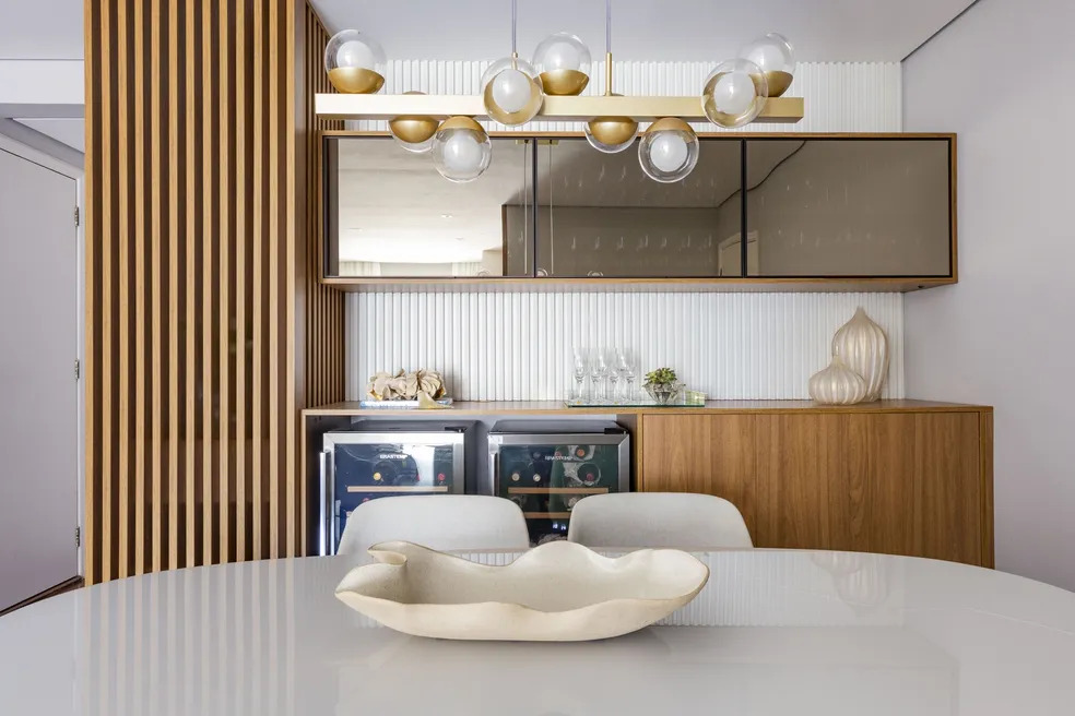 Outra opção é a cristaleira suspensa espelhada, que adiciona um toque de luxo ao ambiente. O espelho no fundo da cristaleira cria uma sensação de profundidade, dando a impressão de um espaço maior.