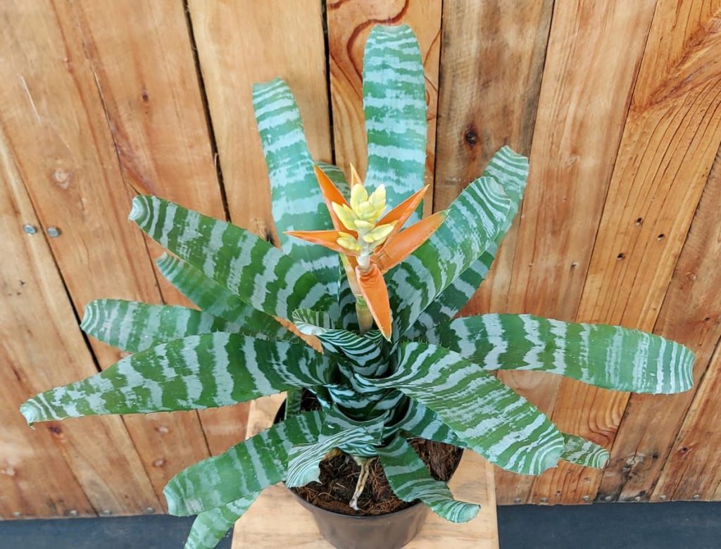A bromélia-zebra (Aechmea chantinii), conhecida por suas listras marcantes que lembram a pelagem de uma zebra, é uma planta exótica e vibrante, que chama a atenção em qualquer jardim.