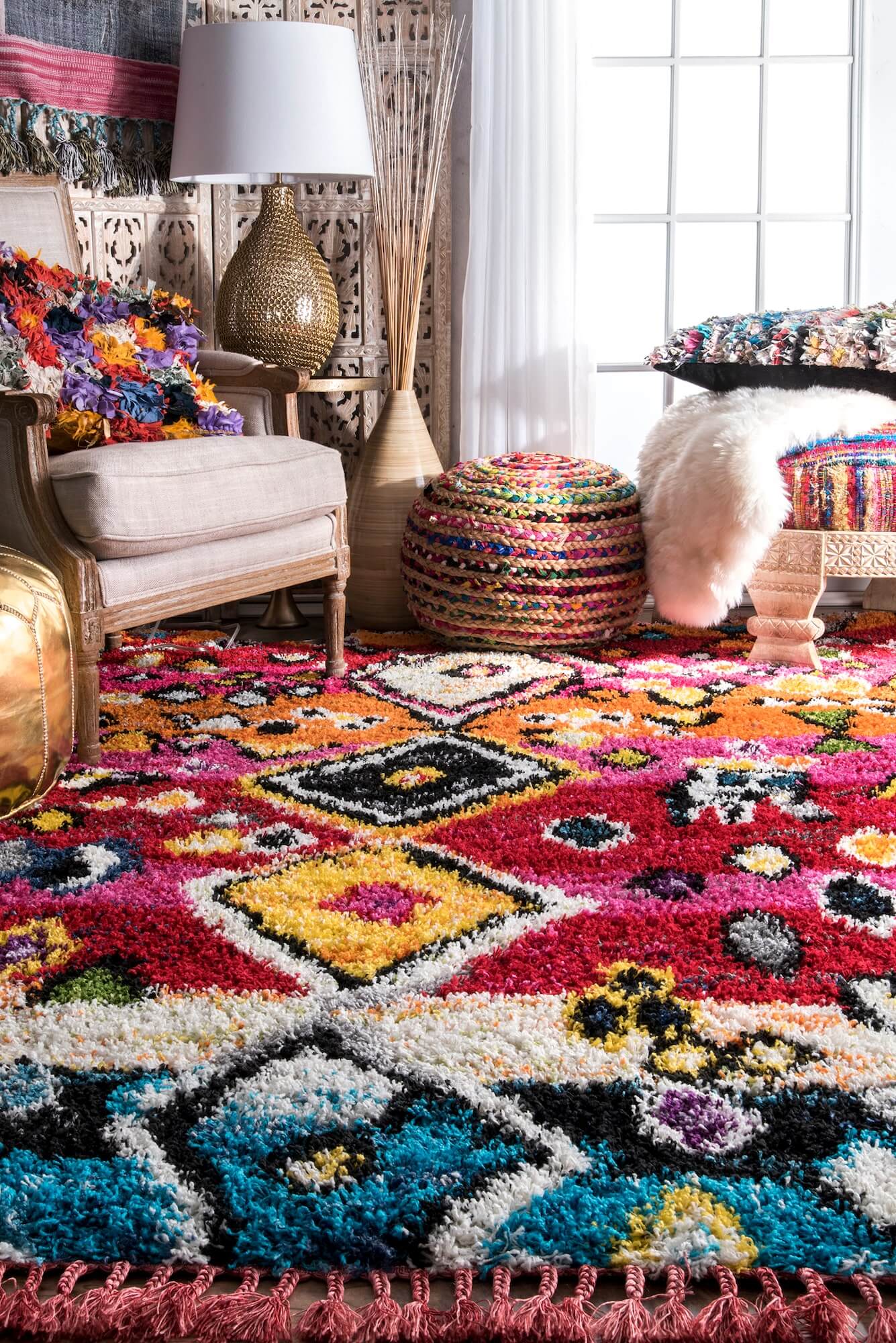 Tapetes com detalhes decorativos, como os com franjas, também são marcantes nesse tipo de decoração e funcionam bem em quaisquer ambientes, não somente em salas e quartos.