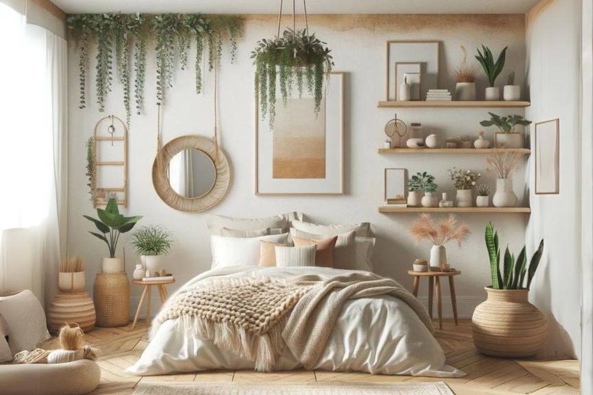 O estilo boho combina elementos naturais e artístico, com cores claras em evidência combinadas com tons que aquecem o cômodo.