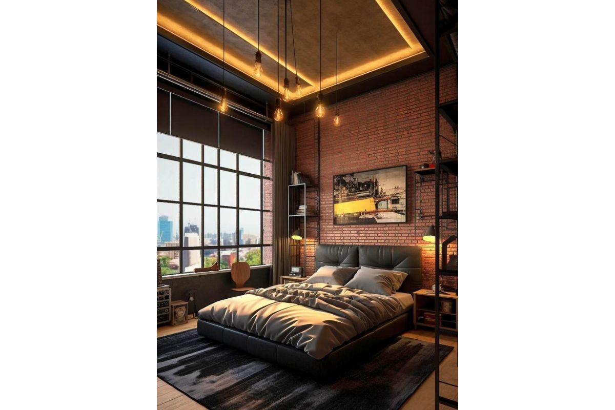 Use materiais como metal, madeira não acabada e concreto para móveis e elementos. Uma parede de tijolos aparentes é um excelente ponto focal. Mobiliário simples e robusto, como uma cama de metal e prateleiras abertas de madeira, definem esse estilo.