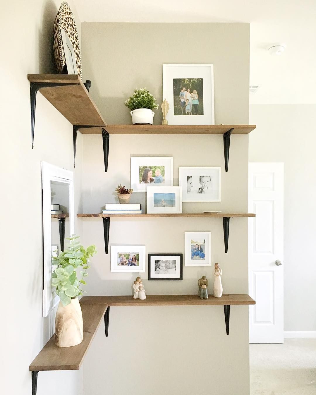 As prateleiras disponibilizam um espaço extra para organizar seu lar, bem como dão charme para a decoração. Aproveite para instalar modelos em L nesse espaço, garantindo uma impressão visual de continuidade e alongamento.