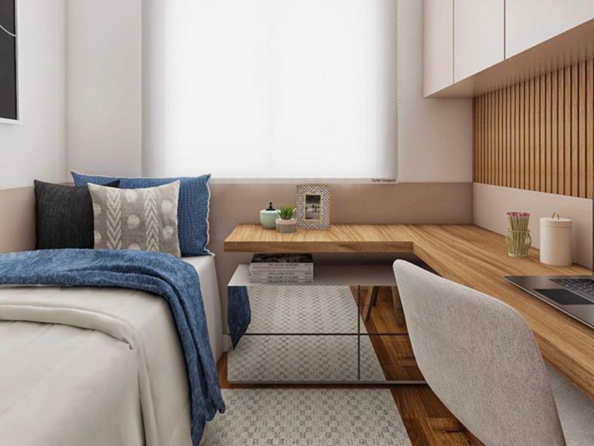 Se quiser separar visualmente o espaço de dormir da área dedicada ao trabalho, a indicação é usar divisórias ou acessórios como tapetes diferentes em ambos os locais. Assim, além de separar os ambientes também dá para complementar sua decoração.